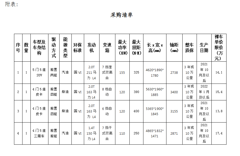 1.根據(jù)業(yè)務(wù)發(fā)展需要,滁州市興元商貿(mào)有限公司擬集中采購(gòu)業(yè)務(wù)保障車輛共計(jì)4輛,詳情見附表。